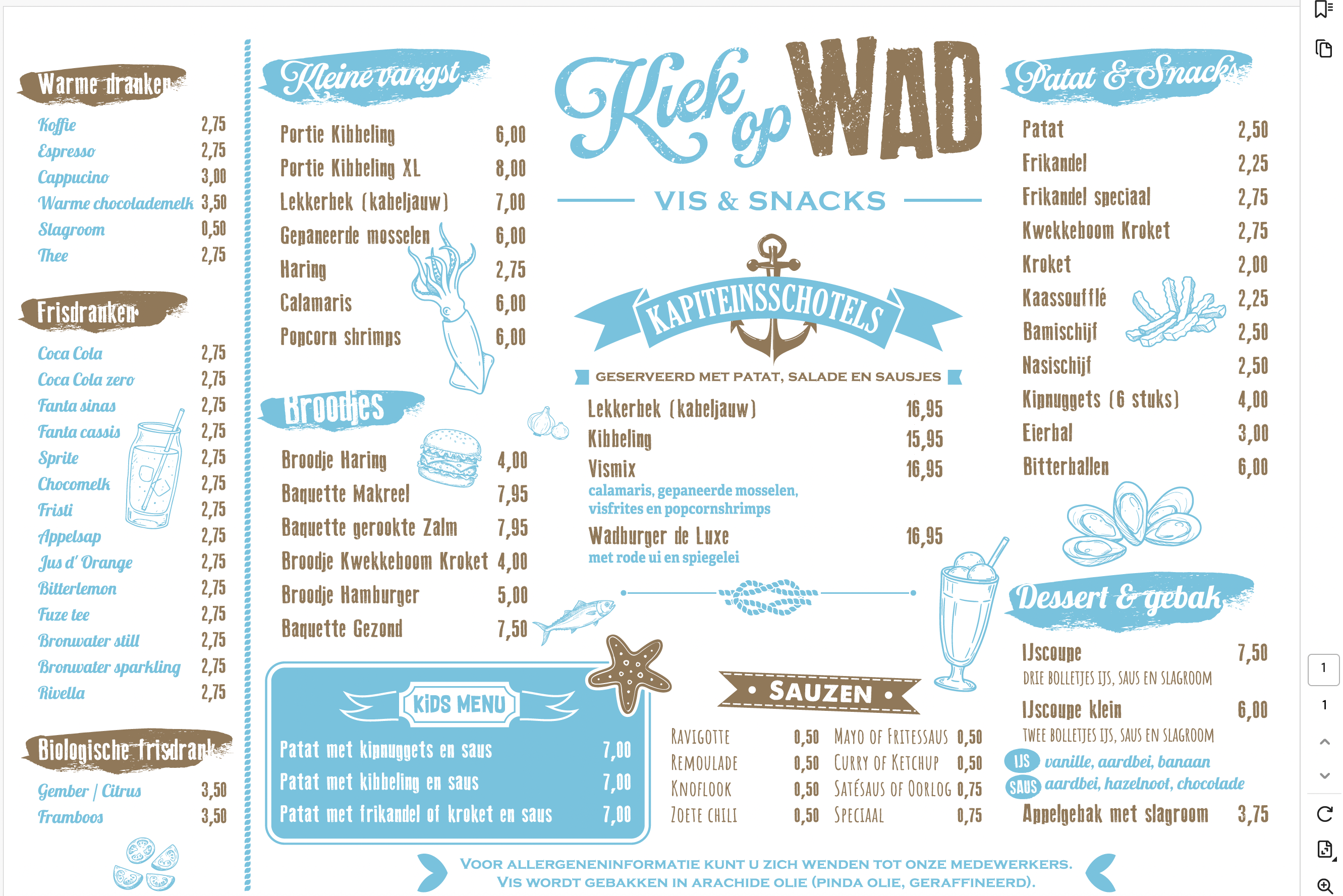 Bij Kiek op Wad draait het niet alleen om het prachtige uitzicht over de Marconi-kwelder, maar ook om lekker eten. Op het menu vind je voor ieder wat wils: verse vis zoals lekkerbek, kibbeling of een vismix. Liever een snelle snack of een goed belegd broodje? Ook daar voor zit je goed. Voor de kleintjes is er een speciaal kidsmenu en zoetekauwen kunnen afsluiten met appelgebak of een verfrissende ijscoupe.